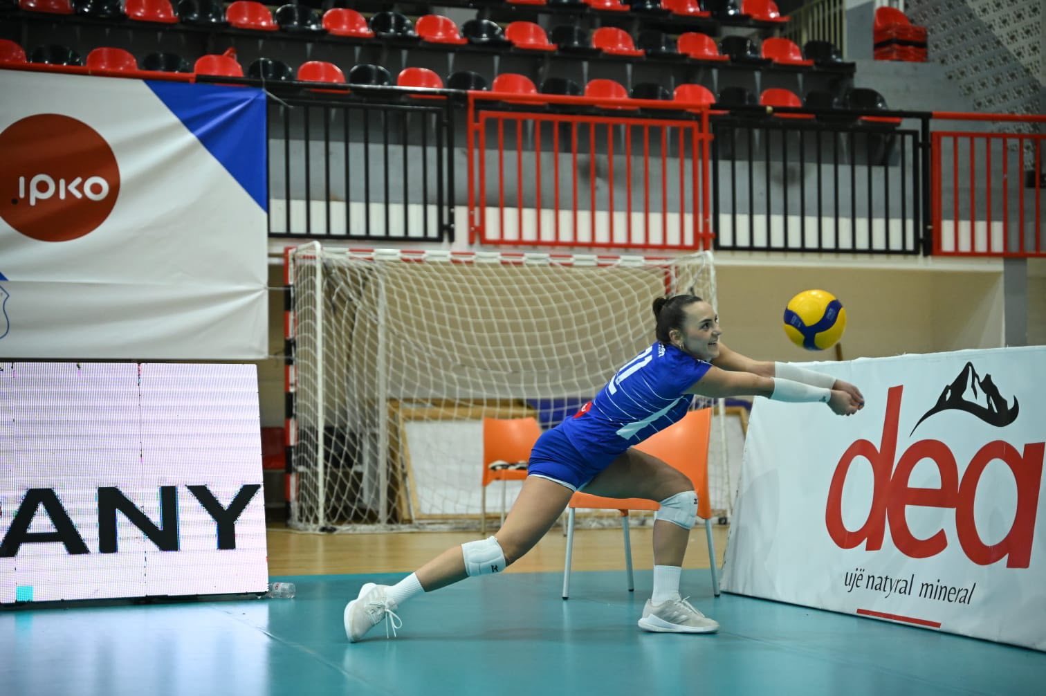 Kjo volejbolliste në foto shihet se si është pozicionuar mirë, me duar të zgjatura e me shikim kah topi, e ekuilibruar me një këmbë në këndin e duhur, e fokusuar me teknikë të përkryer dhe e gatshme për të marrë veprimin tjetër edhe atë në një pozitë ku shumë vështirë është të kapet topi.