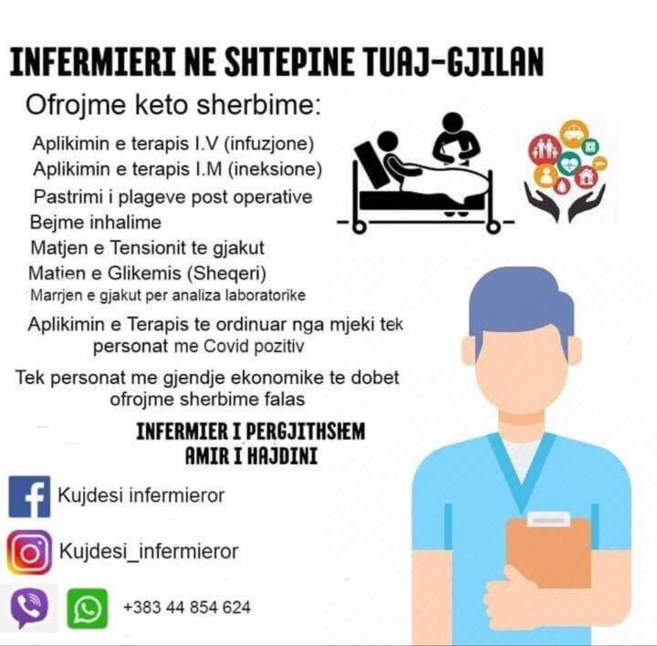 Infermieri i specializuar mbulon një spektër të gjerë të shërbimeve mjekësore për pacientët në Gjilan dhe rrethinë. Ai kryen procedura të shumta si: vendosja e infuzionit, injektimet intramuskulare dhe nënlëkurore, vendosja e kateterit urinar, matja e tensionit arterial dhe glikemisë (sheqerit në gjak), marrja e gjakut për analiza laboratorike, pastrimi i plagëve post-operative, mbikëqyrja e pacientëve në gjendje të rëndë ose pas spitalizimit, si dhe ofron shërbime të personalizuara për të moshuarit dhe pacientët me nevoja të veçanta. Hajdini bën me dije se të gjitha këshillat shëndetësore dhe informatat për shërbimet mund të gjenden edhe në faqen e tij në rrjetet sociale, “Kujdesi Infermieror”.