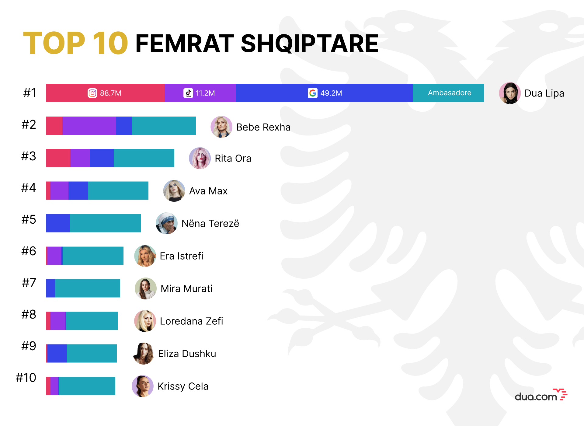 Më 8 Mars festohet Dita Ndërkombëtare e Gruas. Me këtë rast, dua.com hulumtoi mbi 500 femra shqiptare nga e gjithë bota, duke analizuar kërkime në Google, ndjekës në Instagram e TikTok, si dhe arritje ndërkombëtare. Nga këto, u përzgjodhën 100 femrat më të suksesshme shqiptare për vitin 2026.