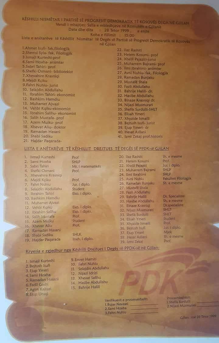 Gazeta Online kryelajmi.com ka siguruar Listën e Anëtarëve të Këshillit Nismëtar të Degës së Partisë së Progresit Demokratik të Kosovës në Gjilan. Në këtë dokument është paraqitur edhe Lista e Këshillit Drejtues të PPDK-së në Gjilan si dhe kryesia e Këshillit Drejtues të PPDK-së.