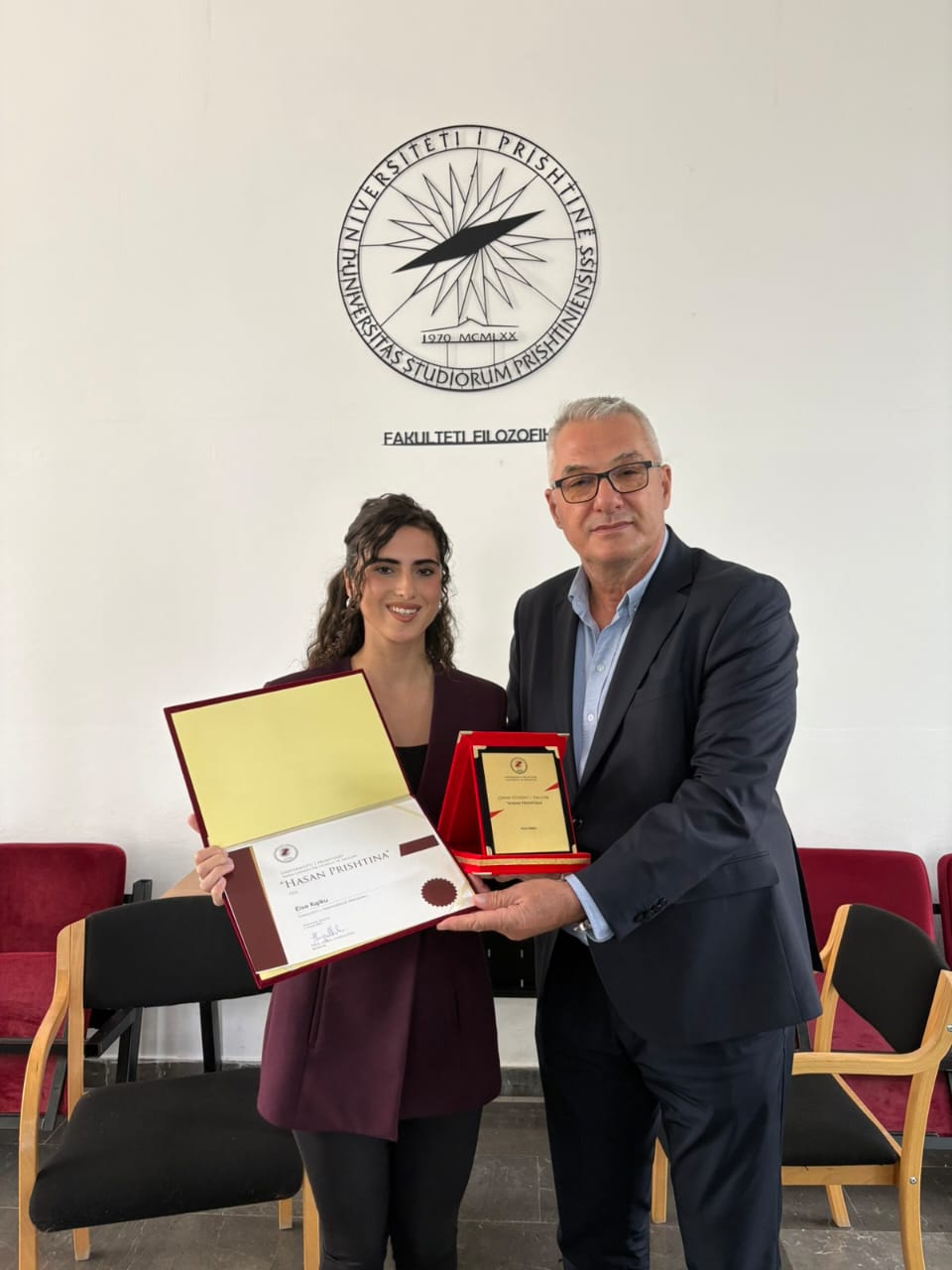 Çmimin „Hasan Prishtina” 28 studentëve të dalluar të UP-së ua ndanë së bashku rektori i Universitetit të Prishtinës, prof. Arben Hajrullahu dhe prorektorja për ndërkombëtarizim dhe shkëmbim akademik, prof. Rozafa Basha.