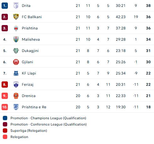 Tabela në Superligë në prag të xhiros XXI