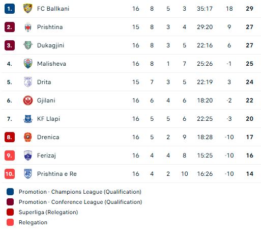 Tabela në Superligën e Kosovës në prag të xhiros XXVII