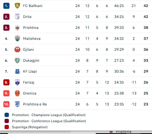 Tabela në Superligë në prag të xhiros XXVI