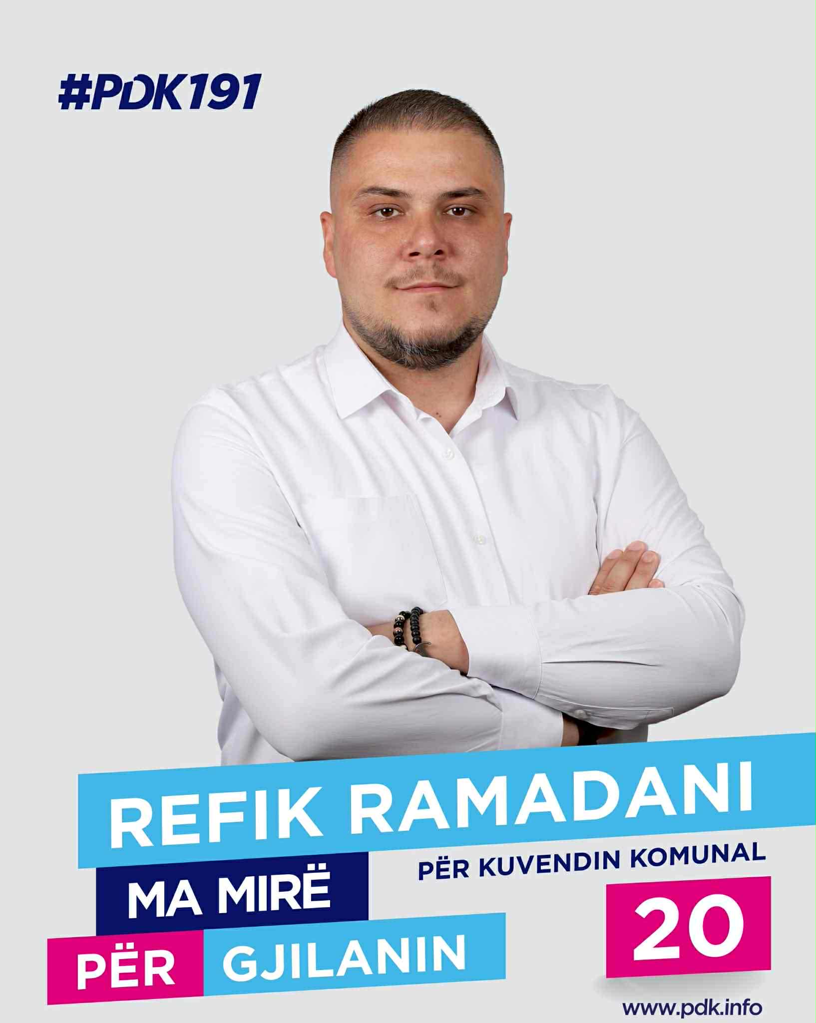 ** Kandidati për këshilltar komunal nga Partia Demokratike e Kosovës (PDK), Refik Ramadani, është pritur me entuziazëm nga banorët e lagjeve Dheu i Bardhë dhe Dardania, në një takim të hapur të mbajtur bashkë me kandidatin për kryetar të Komunës së Gjilanit, Riad Rashiti, dhe kolegët tjerë të listës së PDK-së. Takimi ishte pjesë e turit të prezantimeve që po zhvillon PDK në kuadër të fushatës zgjedhore për zgjedhjet e 12 tetorit.