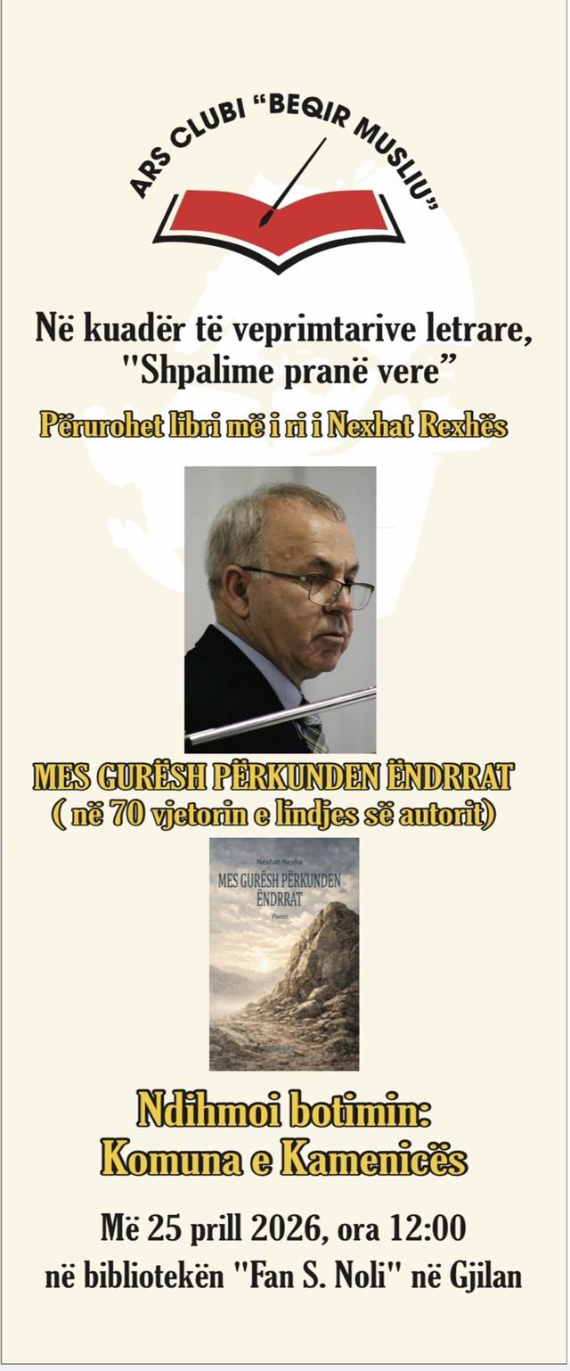 Kësaj të shtune, më 25 prill 2026, ora 12:00, në hapësirat e bibliotekës “Fan S. Noli” në Gjilan, në kuadër të veprimtarive letrare “Shpalime pranë vere”, përurohet libri më i ri poetik i Nexhat Rexhës, MES GURËSH PËRKUNDEN ËNDRRAT, botuar kohë më parë nga sh. b. “Faik Konica” të Prishtinës.